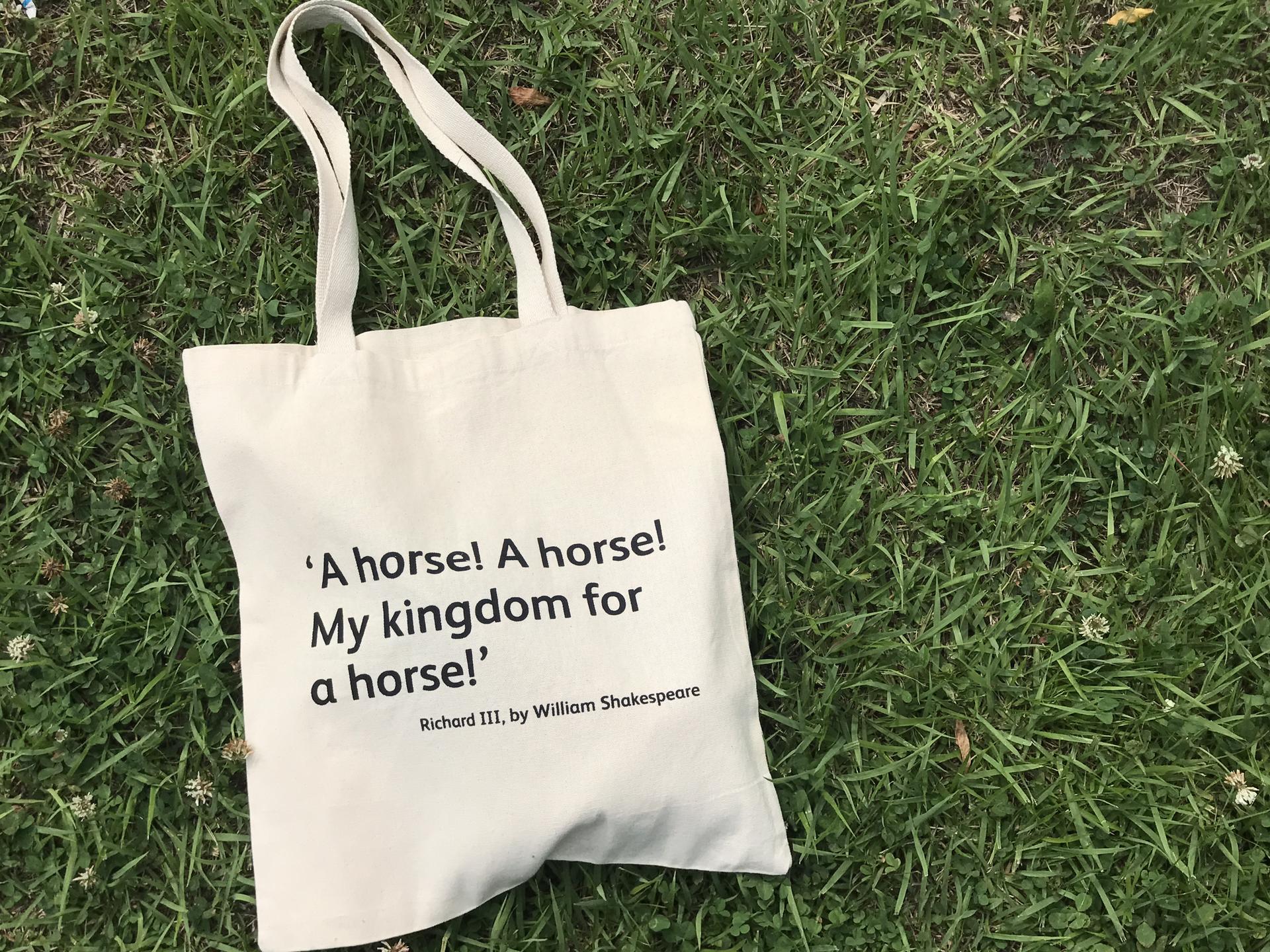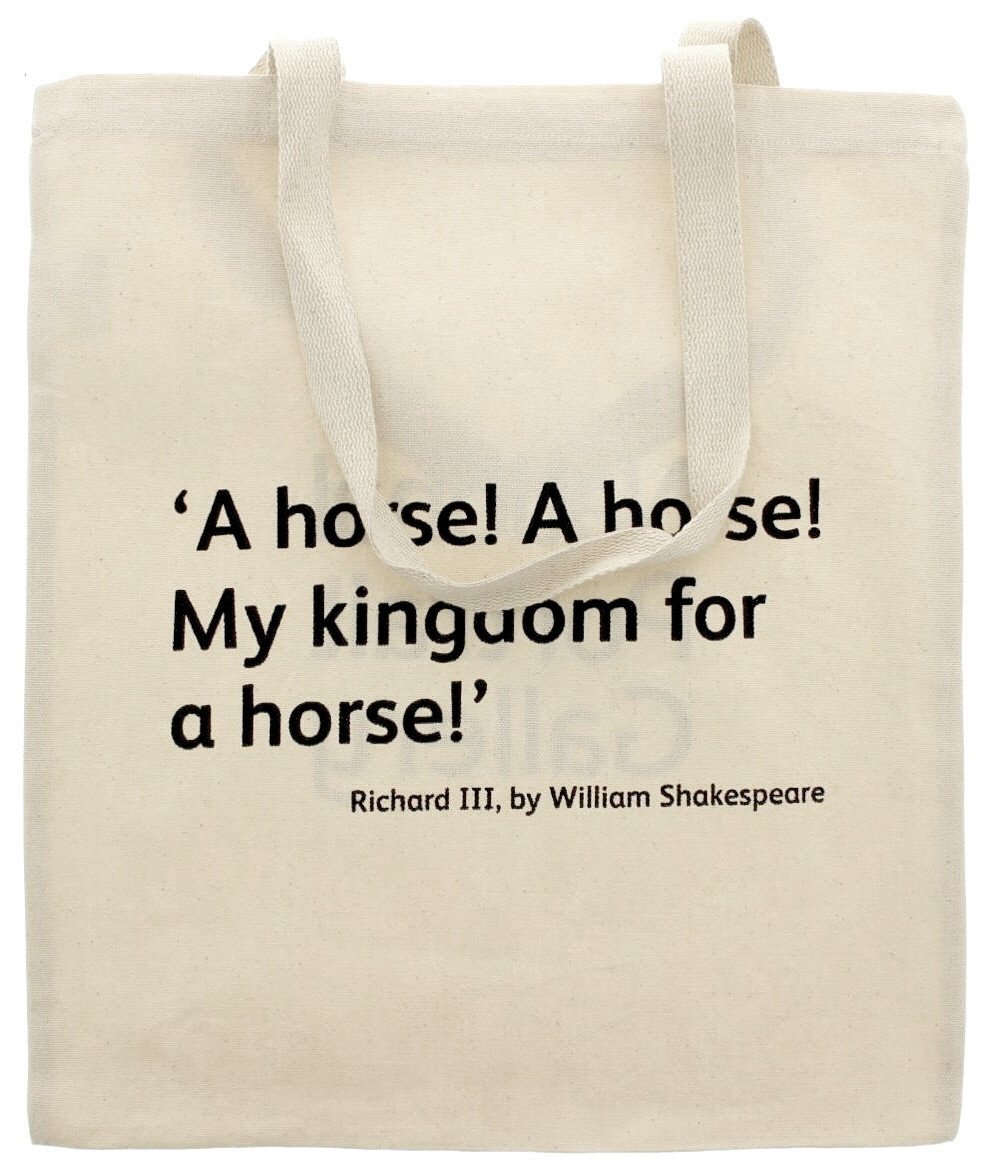 <리처드 3세>제5막 제5장에 나오는 대사입니다.형과 어린 왕자들을 암살해 야망을 성취하고 리처드 3세가 됩니다. 이후 반란군에 의해 말에서 굴러떨어져 궁지에 몰린 상황에 리처드가 비통한 목소리로 외친 대사가 프린트되어있는 내셔널 포트레이트 갤러리 에코백입니다.