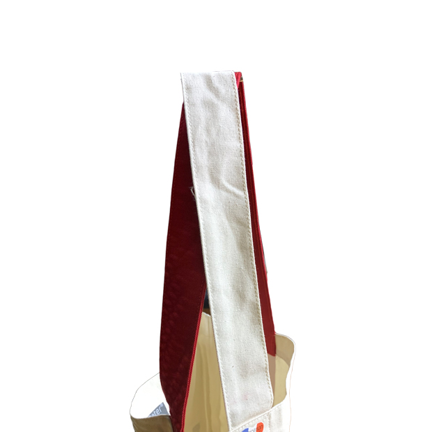 디자인의 특징은 서로 다른 컬러의 어깨 끈이 크로스로 교차된 디자인이며 소재는 두꺼운 두께로 손을 넣었을 때 비침이 없는 얇지 않은 에코백입니다.