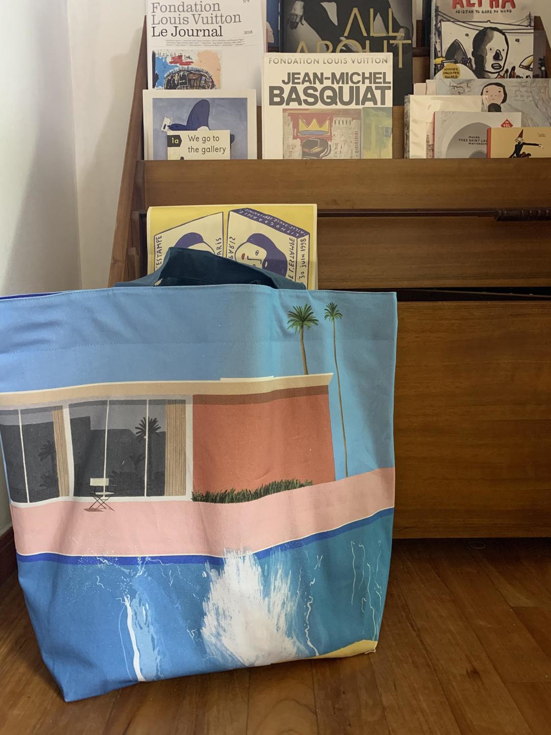 데이비드 호크니(David Hockney)의 영국 전시 기념 에코백입니다. 앞면과 뒷면에 호크니의 Bigger Splash 작품이 프린트되어 있는 빅 사이즈의 가방입니다. 가방의 안감은 PVC 코팅 폴리에스터로 생활방수가 되는 소재로 제작되어 있습니다. 재미있는 부분은 외부는 수영장 작품을 인쇄하고 안쪽 면을 파란색으로 디자인해 마치 수영장 안의 모습 같아 보이는 느낌을 주는 가방입니다. 사이즈가 기존의 다른 가방보다 상당히 커서 많은 소품이 수납 가능합니다. 여름에 비치로 놀러 가거나 가까운 여행지로 여행을 갈 때 사용하기 좋은 가방입니다.