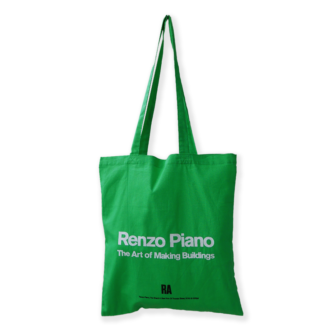 렌조 피아노(renzo-piano)의 전시를 기념하여 제작된 에코백입니다. 한쪽 면에는 렌조 피아노(renzo-piano)가 설계한 런던의 SHARD PLACE의 건물의 스케치가 그려져 있으며 다른 쪽 면에는 렌조 피아노의 이름과 the art of making buildings 가 프린트되었습니다. 진한 연두색 컬러이며 손을 넣었을 때 비침이 없고 손가락의 실루엣은 살짝 보이는 두껍지 않은 가방입니다.