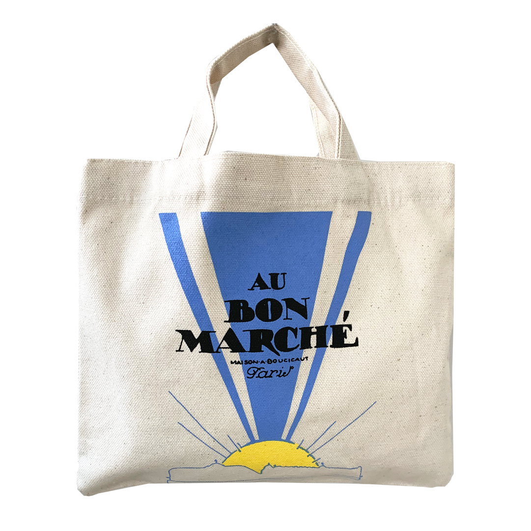 르봉 마르셰 (Le Bon Marché) 미니 사이즈의 에코백입니다. 노랑색 태양이 떠오는 프린트가 앞뒤로 프린트 되어있습니다. 사이즈는 가로 사이즈가 A4 긴 변보다 짧으며 끈의 길이는 팔목에 걸치거나 손으로 잡을 정도의 길이입니다. 많은 물건들은 수납하기 힘들지만 간단한 소지품이나 보조가방으로 사용하기 좋은 에코백입니다.