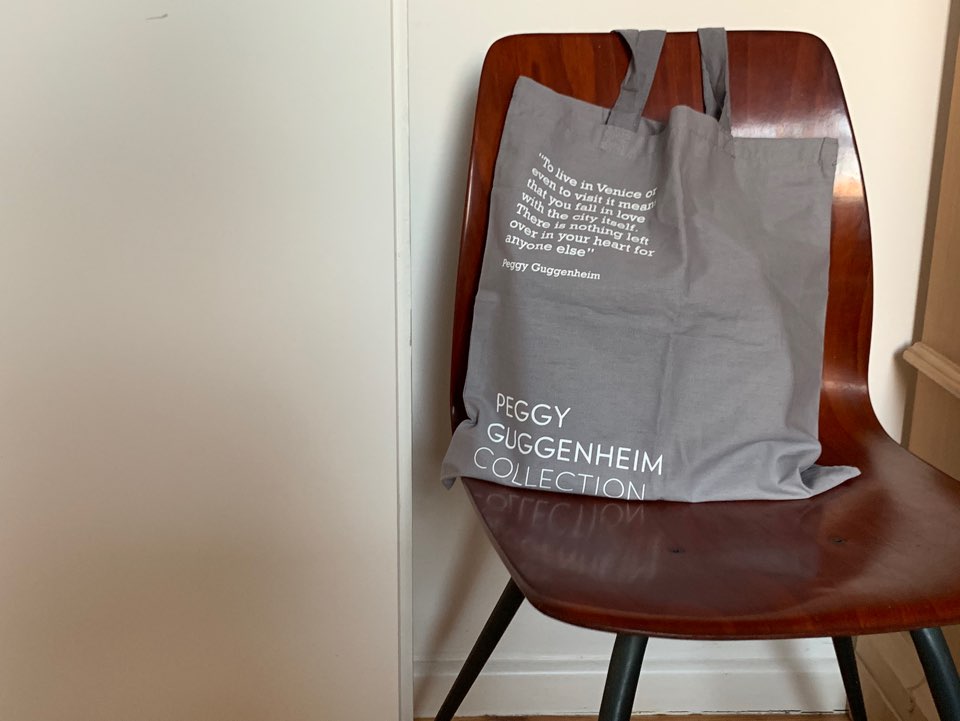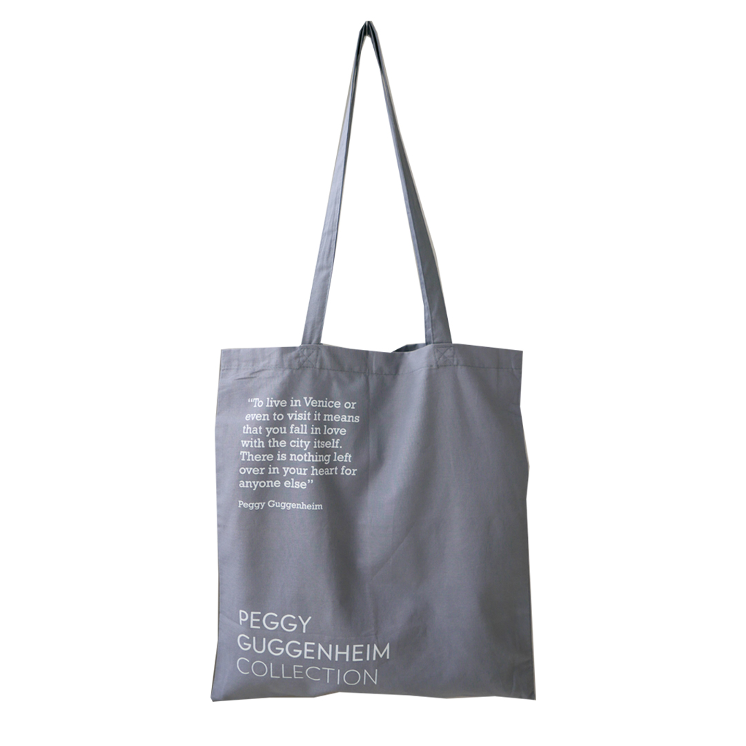 베네치아에 위치해있는 페기 구겐하임 (Marguerite Guggenheim) )의 에코백입니다. 베이지원단에 페기 구겐하임 (Marguerite Guggenheim) 이름이 흰색으로 프린트 되어 있습니다. 뒤면은 무지인 한쪽면만 프린트 되어있는 디자인의 가방입니다. 원단의 두께는 비침이 없으며 화이트보다는 베이지에 가까운 코튼 100% 소재의 가방입니다.