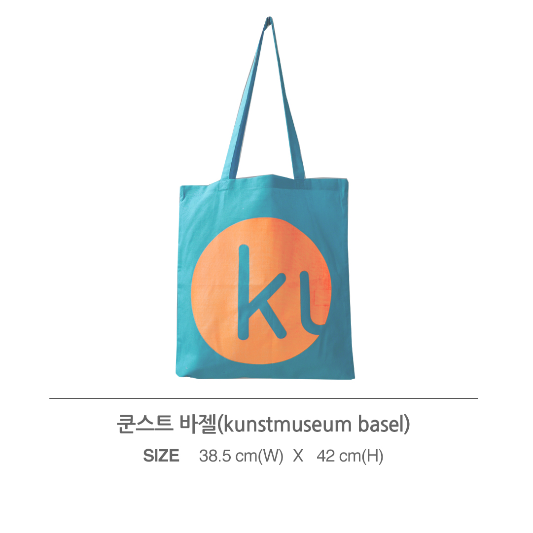 스위스 베젤에 위치한 쿤스트 바젤(kunstmuseum basel)의 에코백입니다. 청록색 원단에 쿤스트 바젤의 로고가 형광 주황색으로 프린트되어 있습니다. 뒷면에는 미술관의 이름이 앞면과 같은 컬러로 프린트되어있는 디자인의 가방입니다. 얇은 편의 원단이지만 비침이 없고 코튼 100% 소재의 가방입니다.