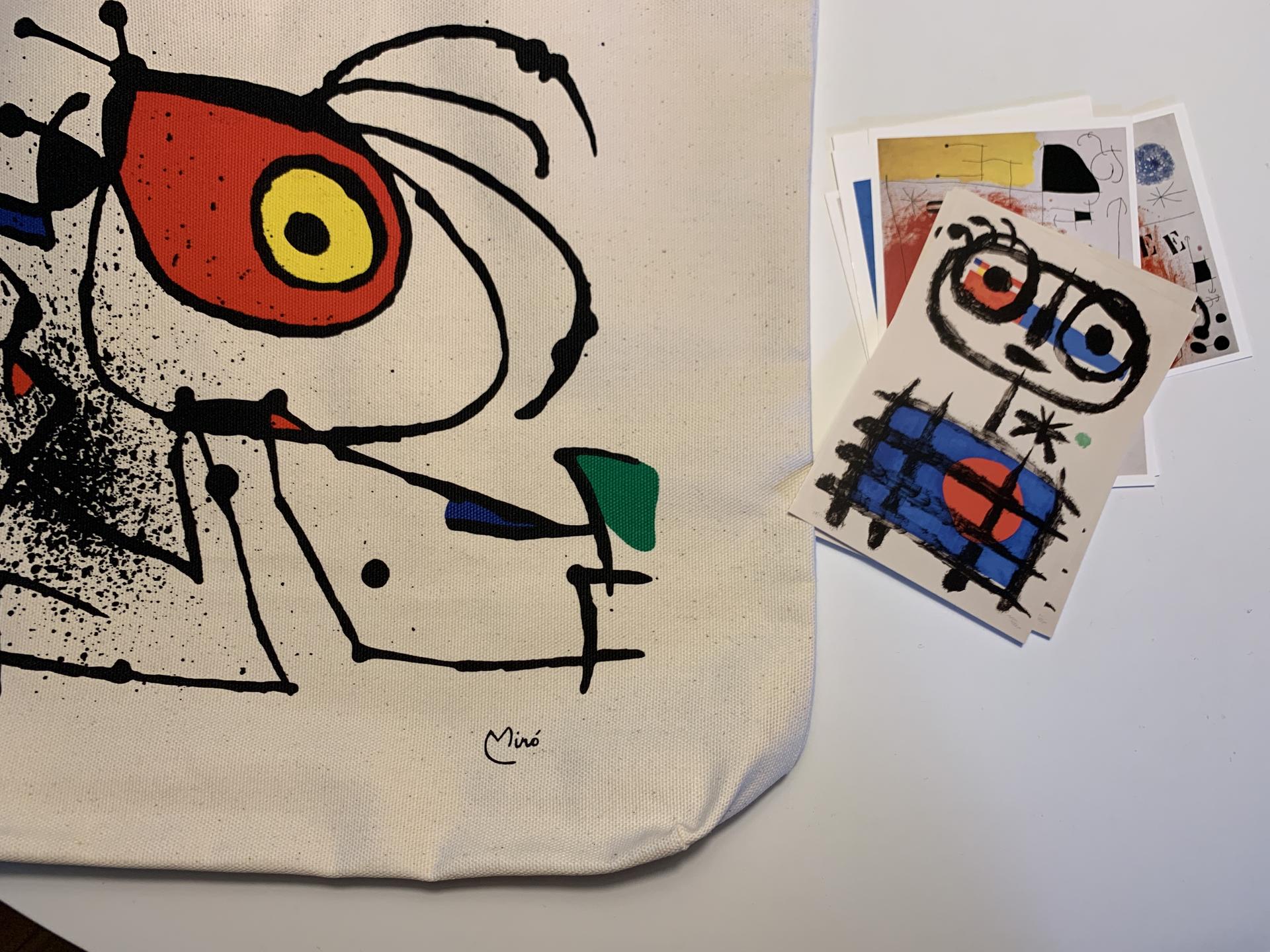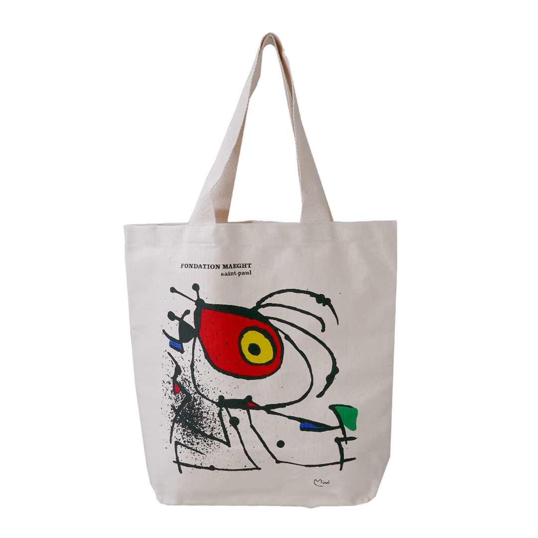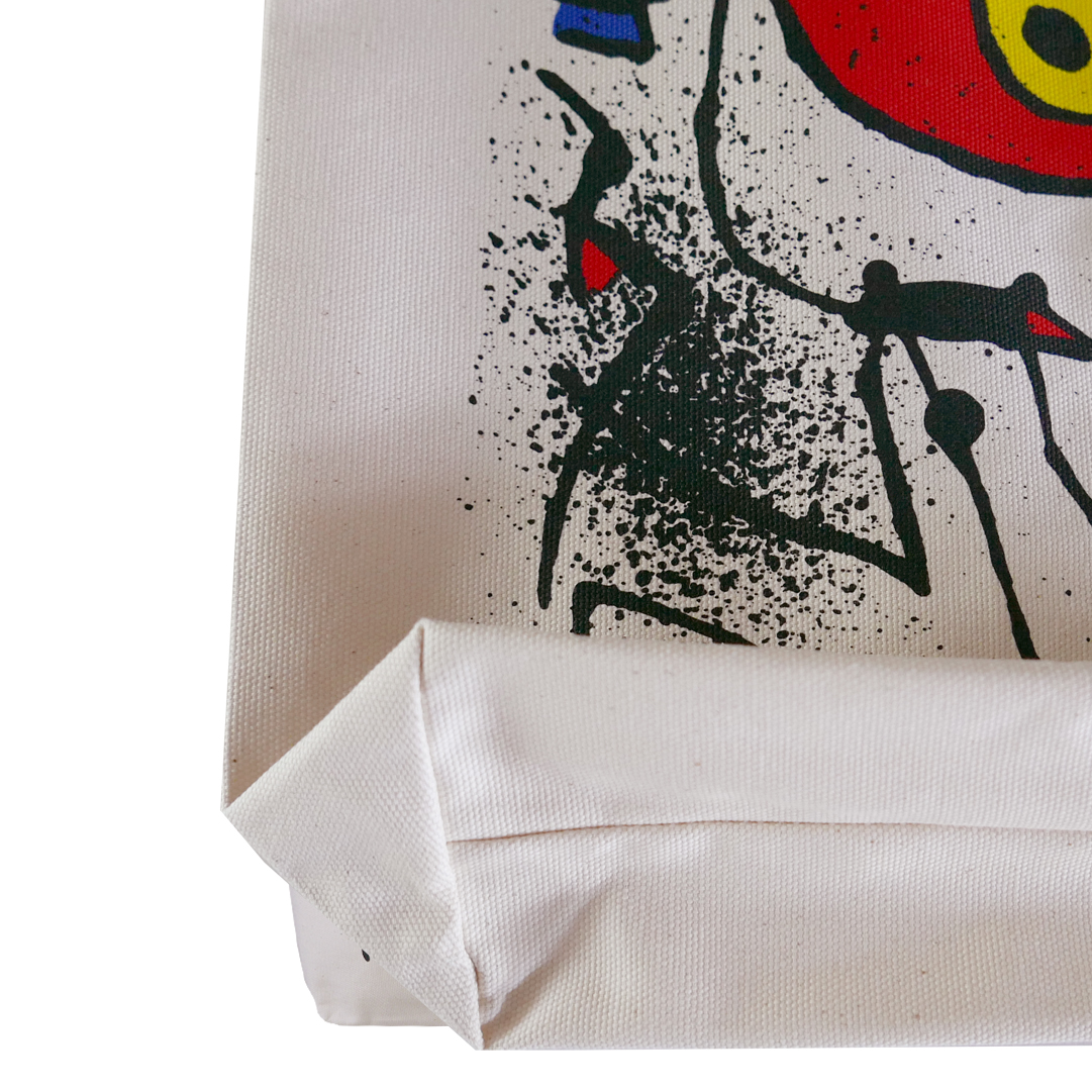 호안 미로의 작품이 앞뒤 프린트 되었는 가방입니다. 흰색의 원단에 호안 미로가 1973년에 조각품 전시 Sculptures de Miró, céramiques de Miró et Llorens Artigas 제작한 카타로그로에 실려있는 작품이 프린트되어 있습니다. 밑면이 있고 가방의 모양이 흐트러짐이 없는 두꺼운 원단으로 비침이 없는 코튼 100% 소재의 가방입니다.