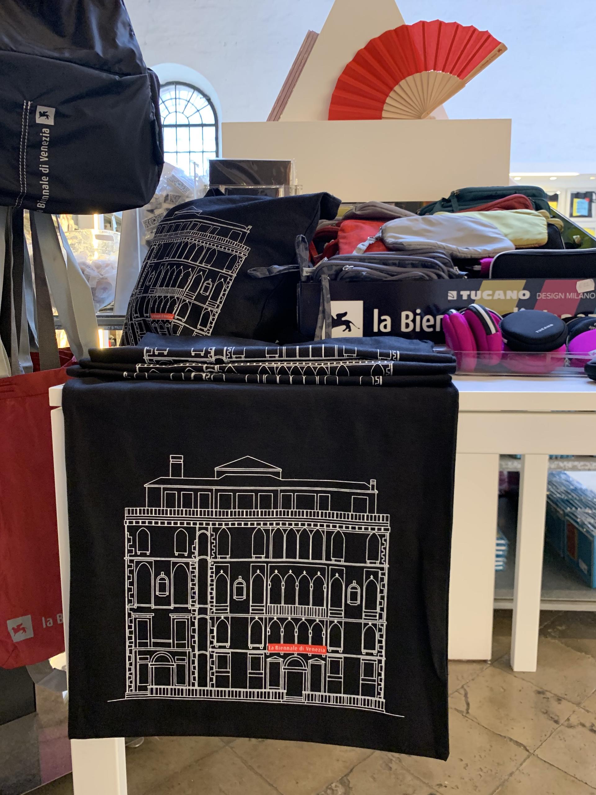 베네치아 비엔날레의 에코백입니다. 검은색 원단에 흰색으로 2019 비엔날레의 오피스로 쓰이는 건물(Ca' Giustinian)이 프린트되어 있고 뒷면은 빨간색 비앤날래 황금 사자와 마크가 프린트되어있는 가방입니다. 가방의 두께는 손을 넣었을 때 손이 비치지 않는 두꺼운 가방입니다