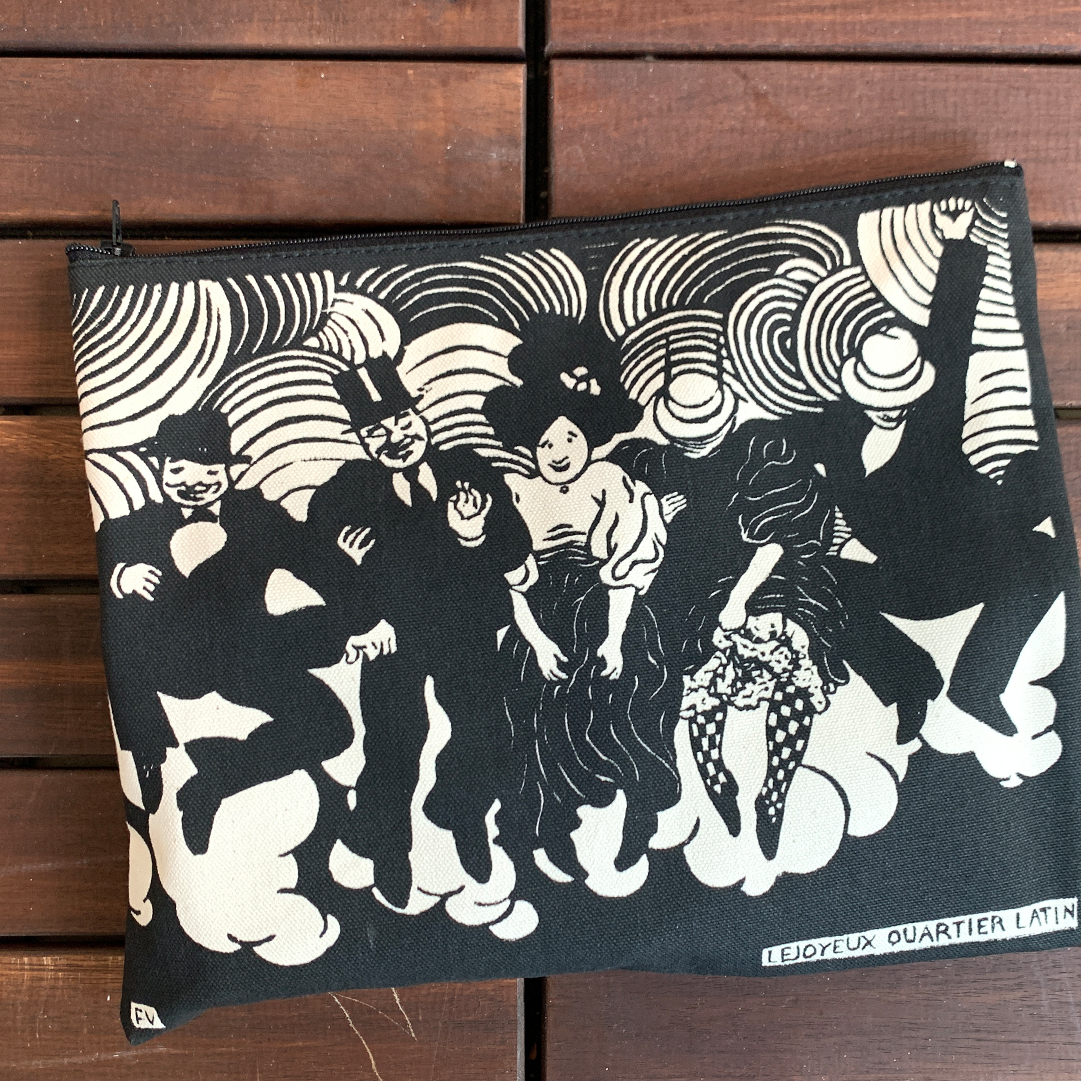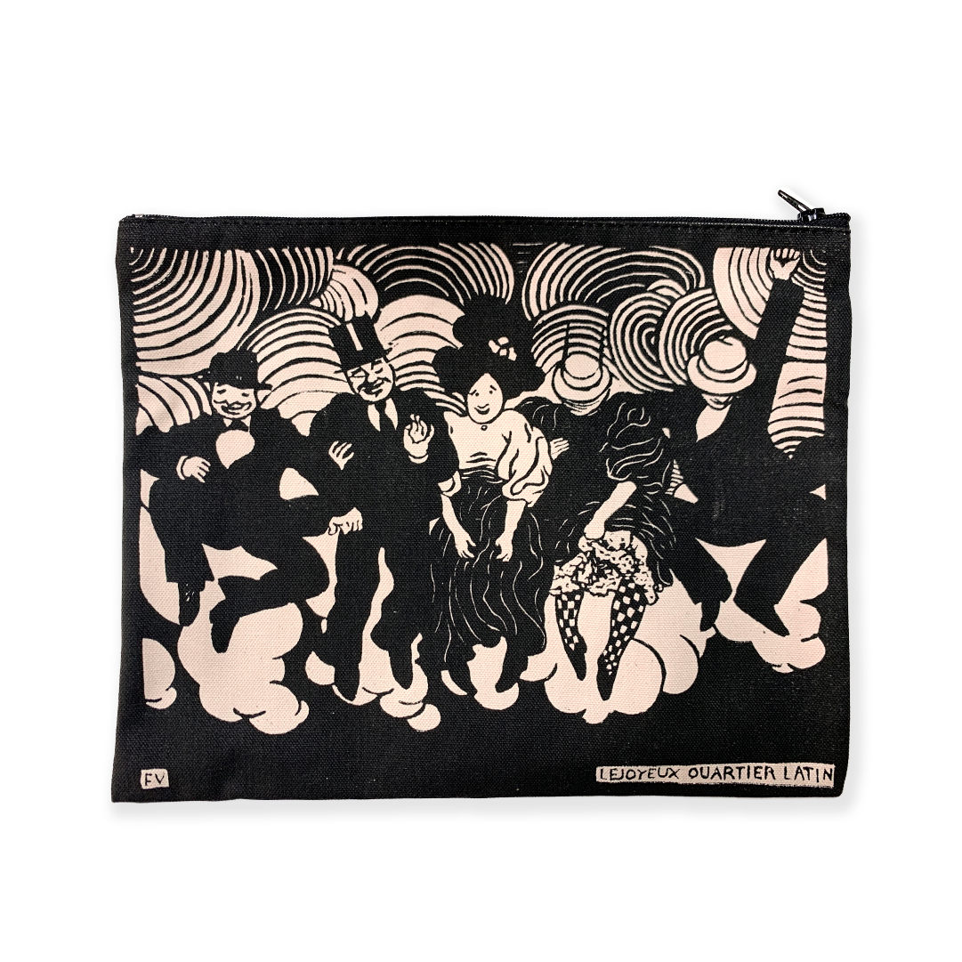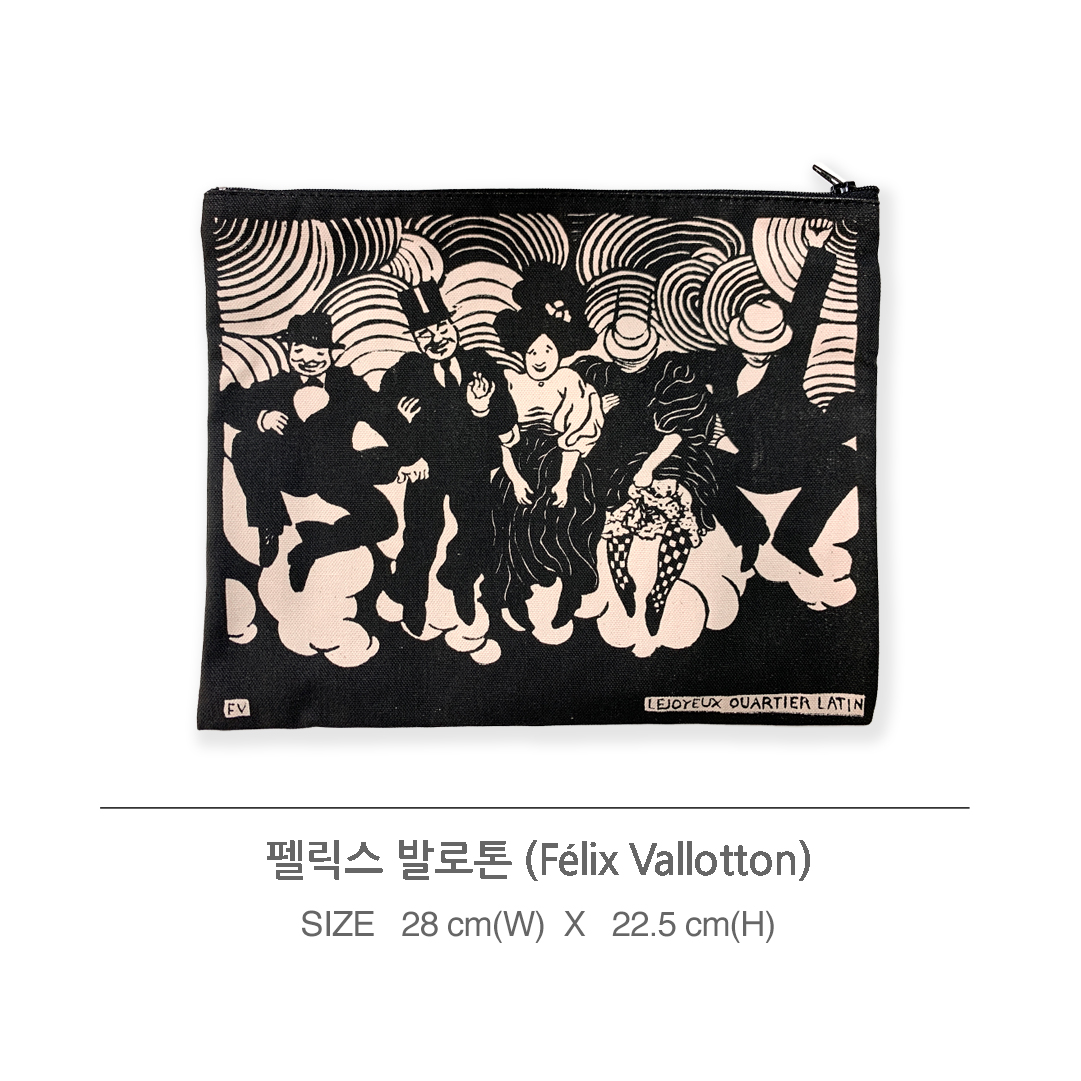 펠릭스 발로톤 (Félix Vallotton)의 목판화 Lejoyeux Quartier Latin 그림이 프린트되어 있는 에코백입니다. 앞면과 뒷면이 같은 디자인입니다. 클러치 백으로 사용하기 좋은 크기가 넉넉한 가방이며 보통 생각하시는 파우치보다는 사이즈가 크니 구매 전에 사이즈를 확인하시고 구매해주세요. 두께는 손을 넣었을 때 손이 비치는지 않는 두께이며 안감이 있는 가방입니다.