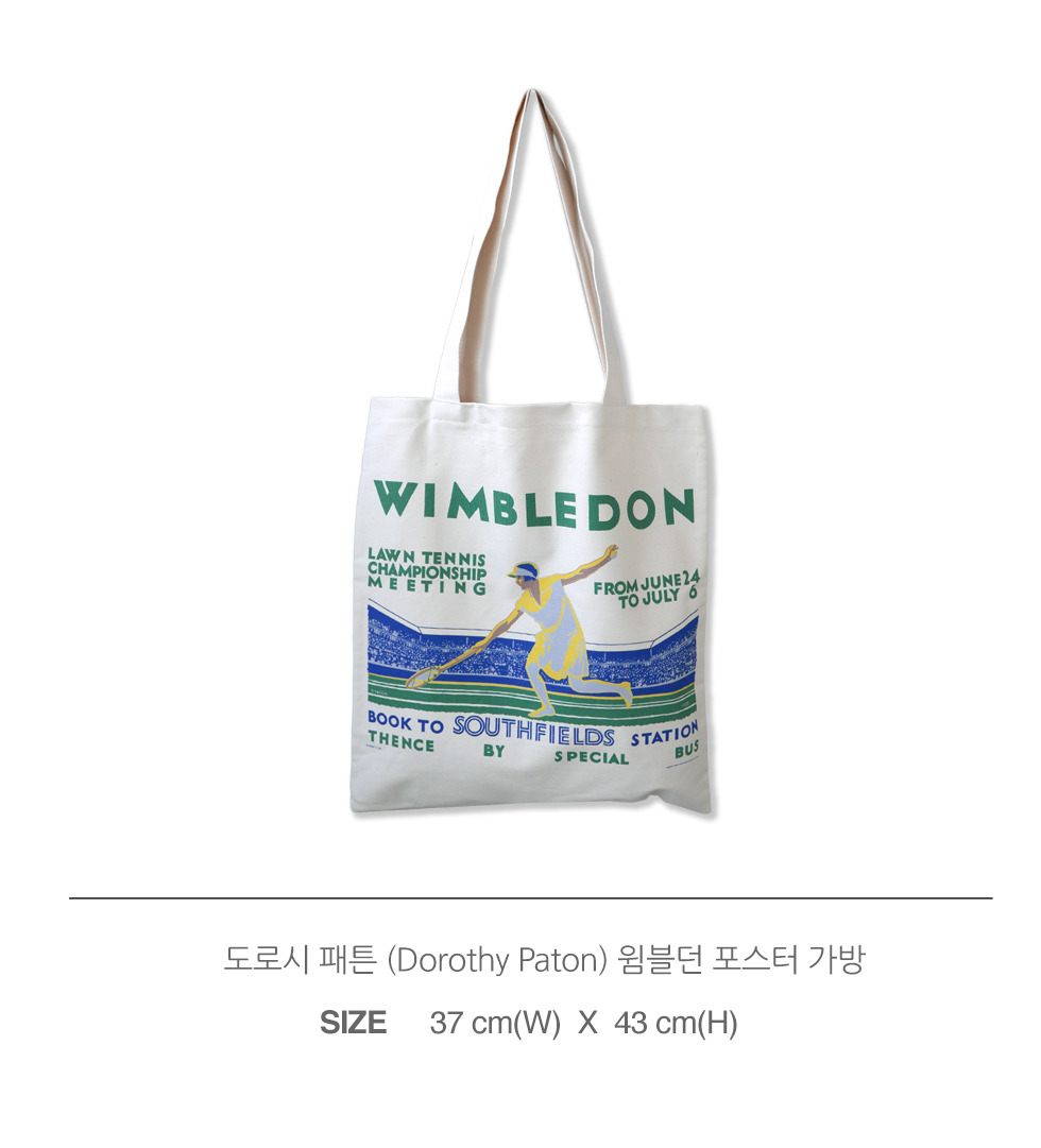 영국의 화가인 도로시 패튼 (Dorothy Paton)이 그린 1929년 윔블던 대회의 포스터가 프린트된 가방입니다. 빈티지한 느낌의 포스터 그래픽이 매력적인 가방으로 앞면과 뒷면에 동일한 그림이 프린트 되어있으며 비침이 없고 흐물거리지 않는 두꺼운 가방입니다. (라이센스 계약되어 제작된 제품입니다.)