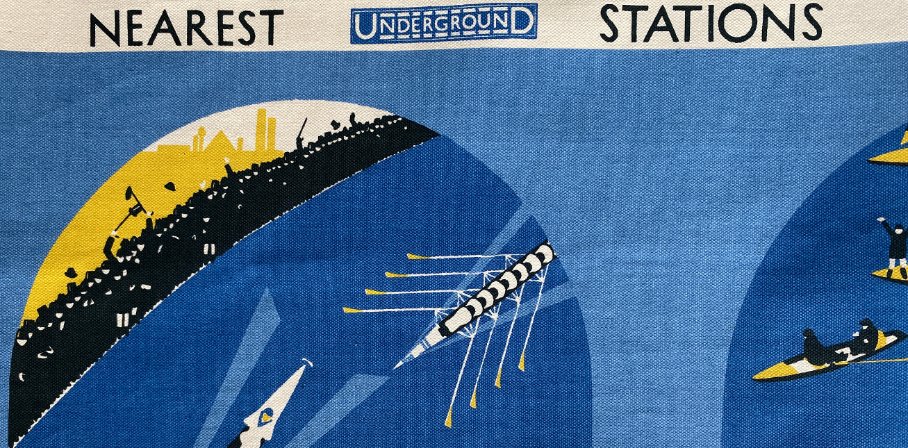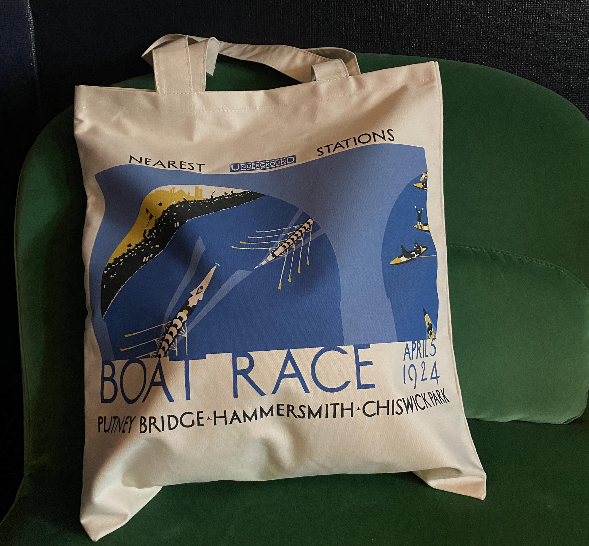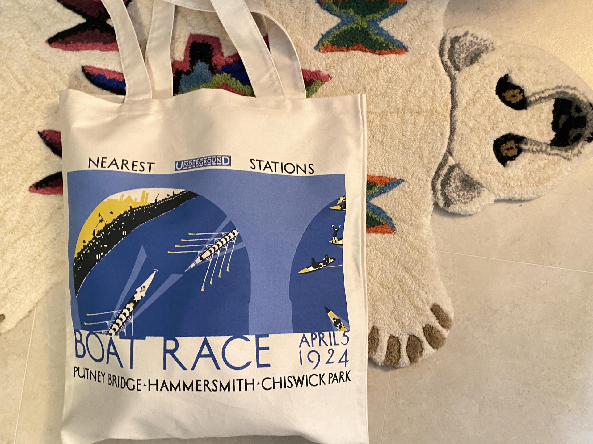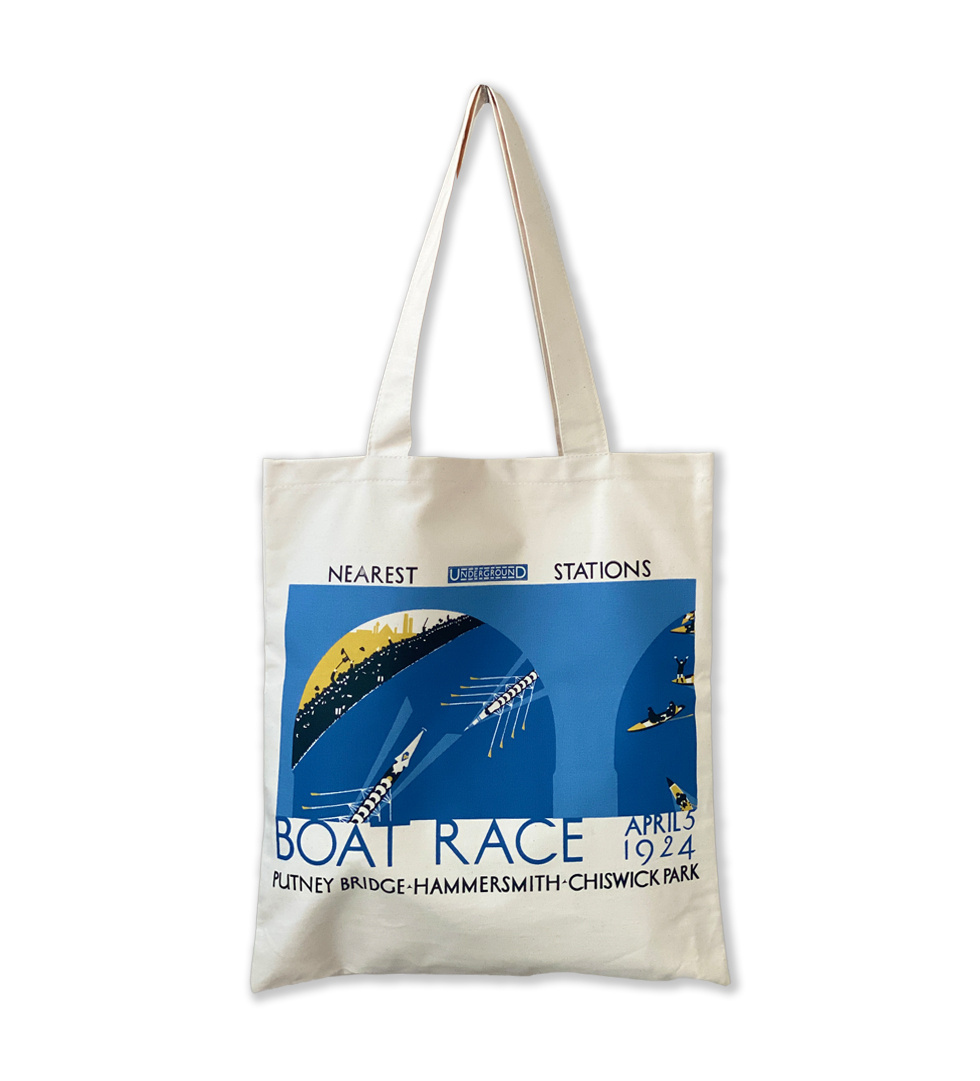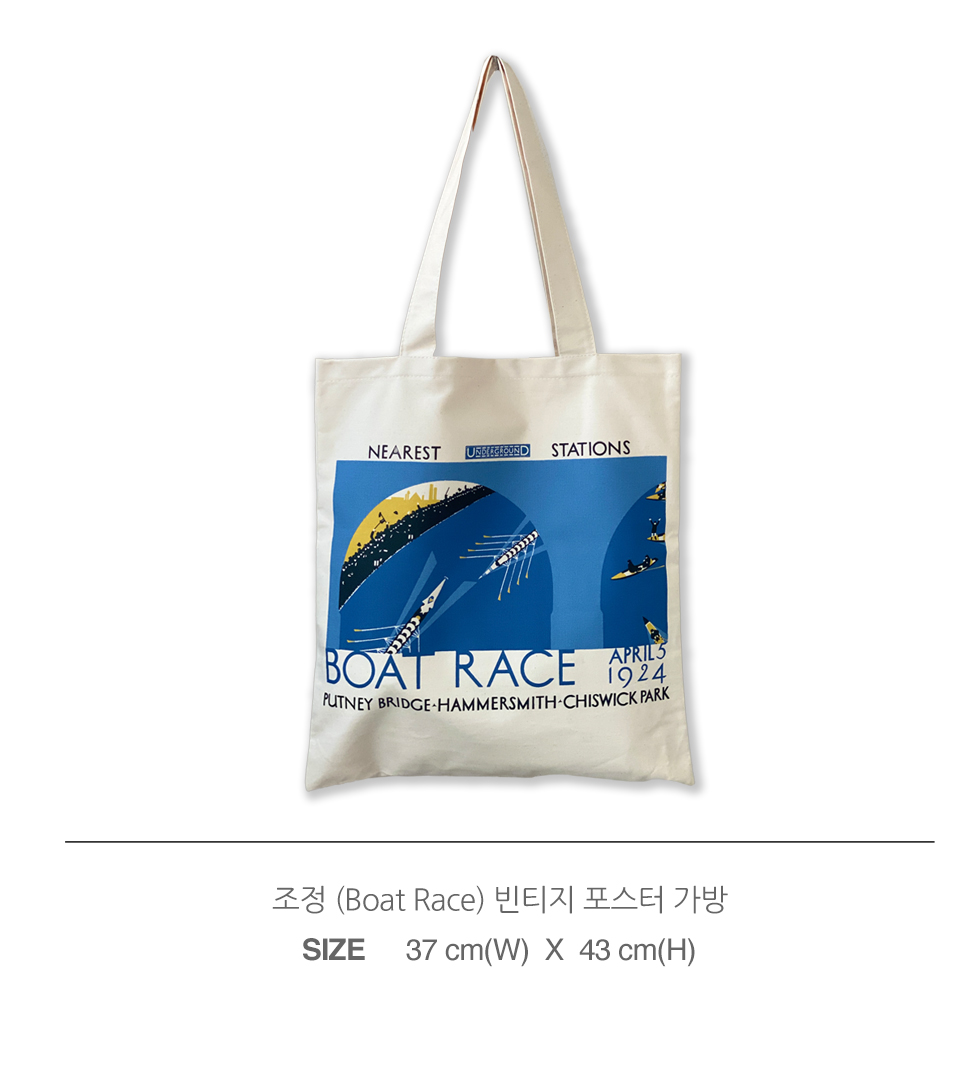 버나드 레슬리, 케이트 M 버렐( Bernard Leslie Kearley and Kate M Burrell) 2명의 아티스트가 디자인한 1924년 열린 조정경기 포스터입니다. 가방의 앞 뒷면에 인쇄된 이미지는 캠브리지 대학교 보트 클럽과 옥스포드 대학교 보트 클럽 사이의 연례 조정 경기의 포스터입니다. 시원한 파란색의 그래픽과 빈티지한 포스터 디자인이 매력적인 가방으로 앞면과 뒷면에 동일한 그림이 프린트되어 있으며 비침이 없고 흐물거리지 않는 두꺼운 가방입니다. (라이센스 계약되어 제작된 제품입니다.)