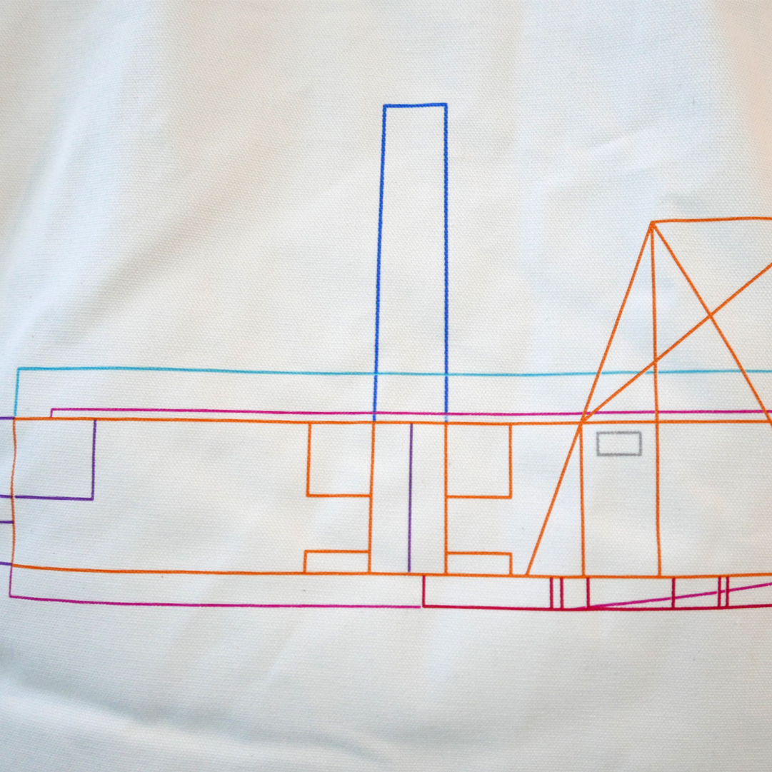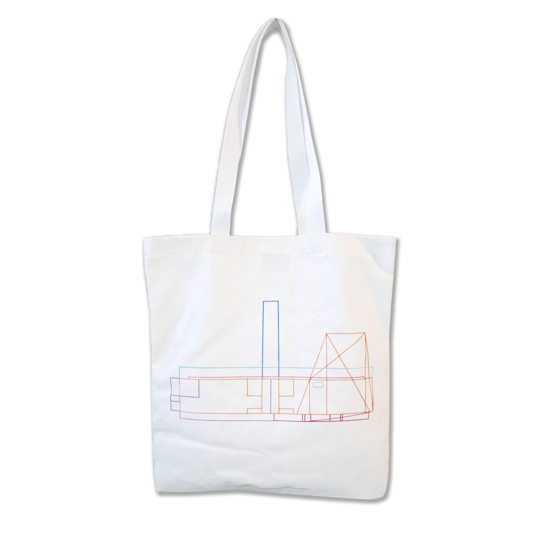 가방의 프린트는 피터 새빌(Peter Saville)이 그래픽으로 표현한 테이트의 모습입니다. 그가 디자인한 그래픽은 테이트 모던의 상징적인 굴뚝은 파란색으로 표현하였고, 지하 탱크 공간은 붉은색, 최상층의 공공장소는 청록색으로 강조되어 있다. 주황색은 2016년 6월 17일 개막을 앞둔 주요 전시공간과 새로운 공간을 묘사하였습니다.