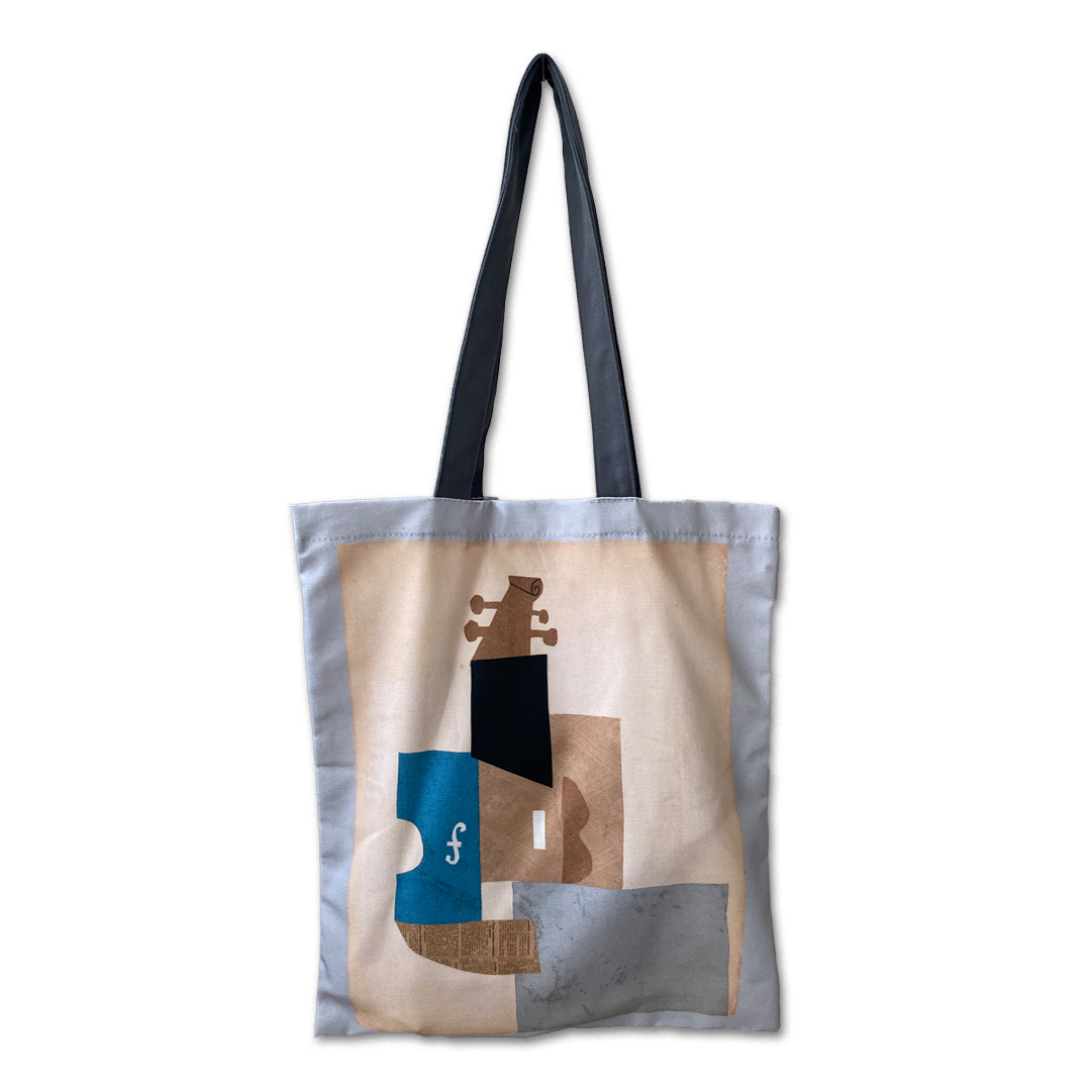 Picasso and Paper 전시를 기념으로 제작된 가방입니다. 종이에 그린 것부터 찢고, 태우고, 입체적으로 그린 피카소의 작품과 콜라주에 이르기까지 80년 경력에 걸쳐 300개 이상의 종이 작품을 선보이는 전시였습니다. 가방의 앞 뒷면에 인쇄된 이미지는 피카소가 그린 바이올린 그림이 가방에 프린트 되어 있습니다. 은은한 베이지색과 회색이 편안한 느낌을 주는 가방으로 앞면과 뒷면에 동일한 그림이 프린트되어 있으며 비침이 없고 흐물거리지 않는 두꺼운 가방입니다.