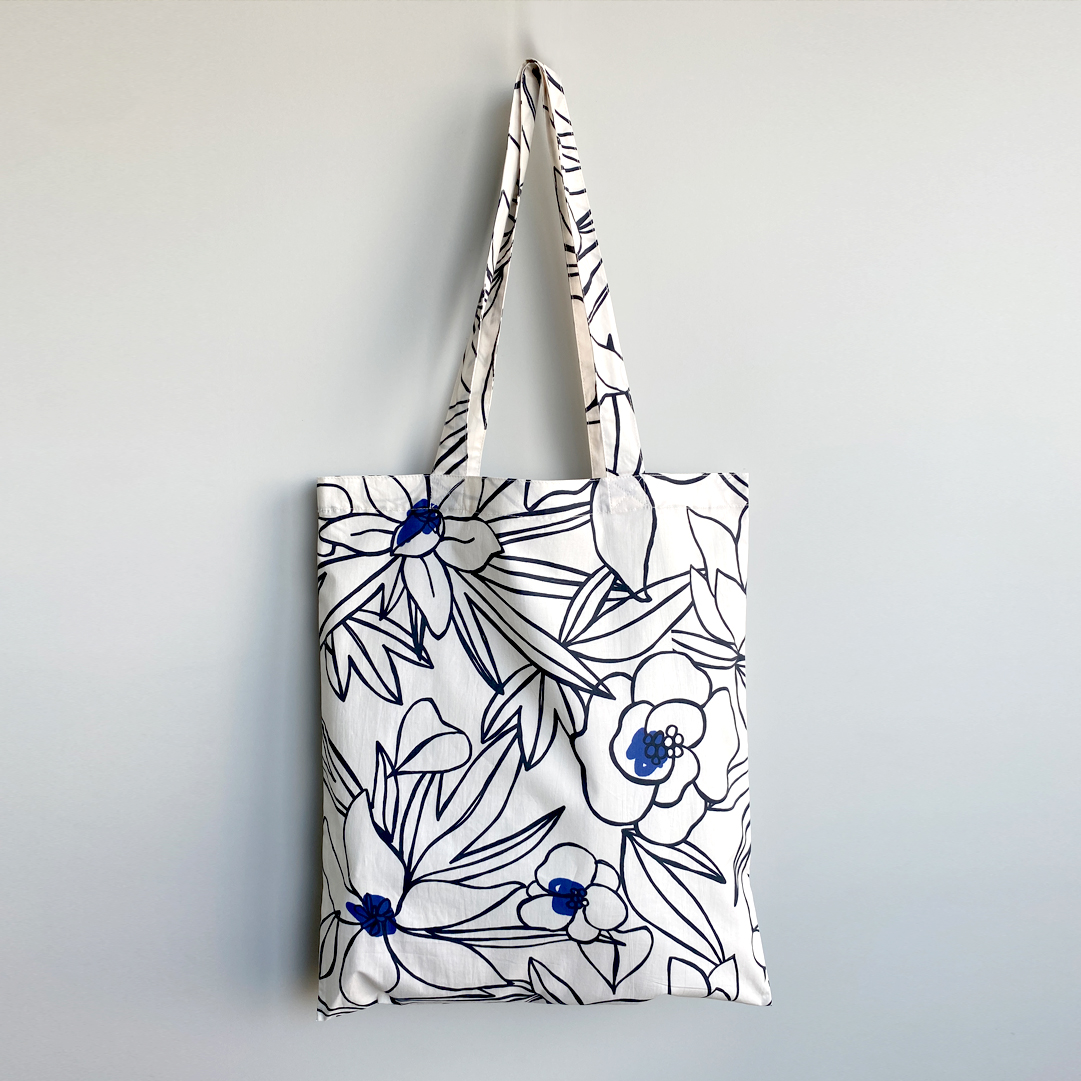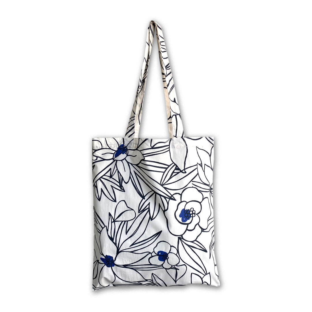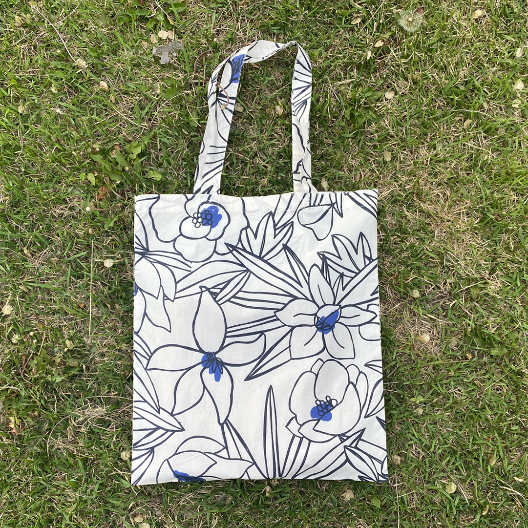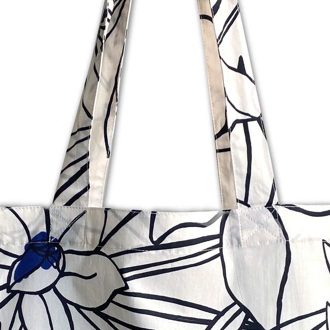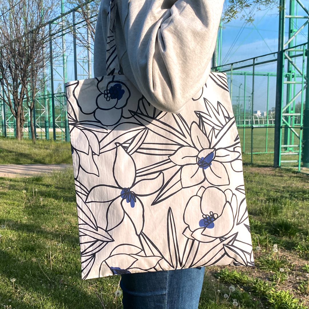 summer flower 하얀 원단에 블랙 라인과 파란색이 꽃이 그려져 시원한 느낌을 주는 가방입니다. 가방의 앞면과 뒷면은 동일한 패턴이며 원단을 잘라만든 제품으로 사진과 패턴이 동일하지 않을 수 있어요.