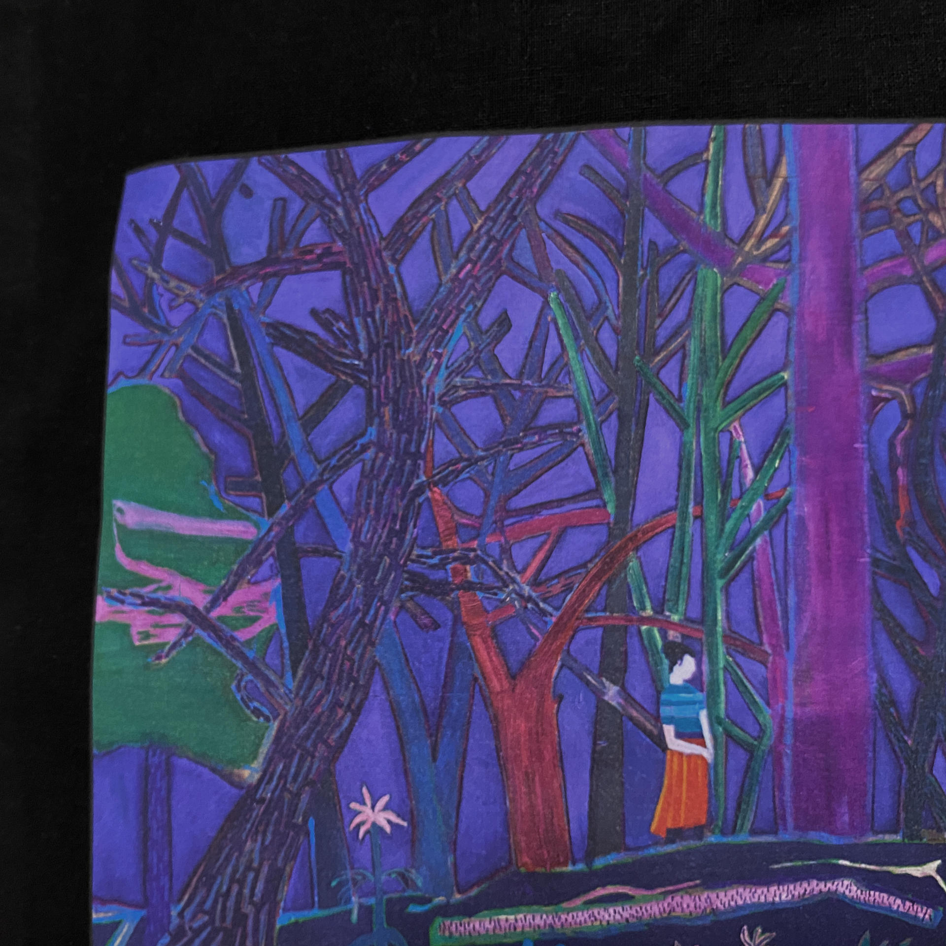 그는 작품에서 환상의 세계를 선보입니다. 오른쪽에는 어딘가를 응시하고 있는 네 명의 인물들이 있고 왼쪽에는 헤어나올 수 없는 숲속 깊이 가족을 안내하는 외로운 여성이 있습니다. 그들의 발아래에는 넘어진 나무들이 있고, 그 위에는 그림의 가장자리 너머로 뻗어 나가는 나뭇가지가 보입니다. 해믹의 작품들은 기이하고 몽환적이지만, 그는 우리 세계가 직면하고 있는 현재의 문제들에 관해 이야기합니다. 작가는 이 작품이 '지금 우리가 있는 곳, 우리가 돌고 있는 이 멋진 행성과 깊은 연관성을 보여주는 그림'에 관한 것이라고 설명합니다.