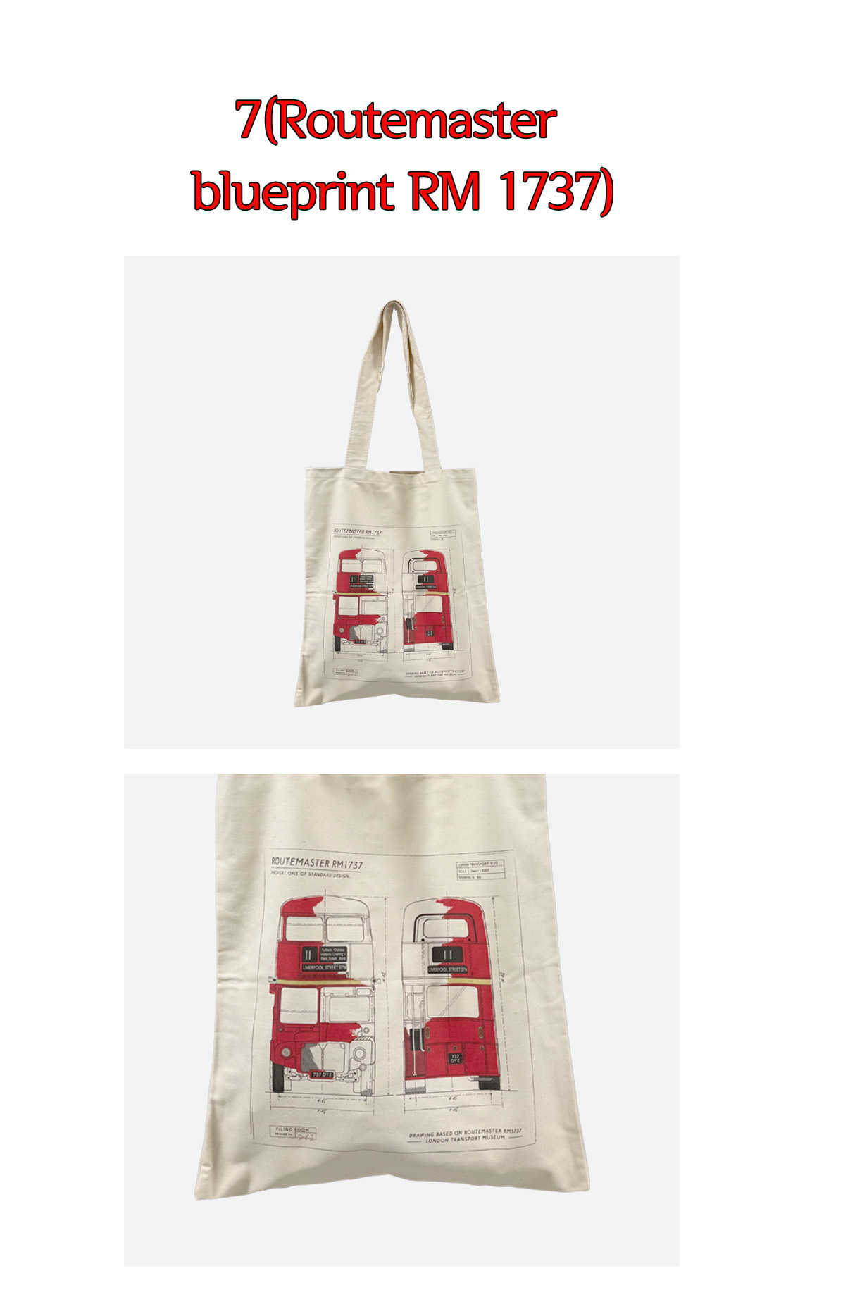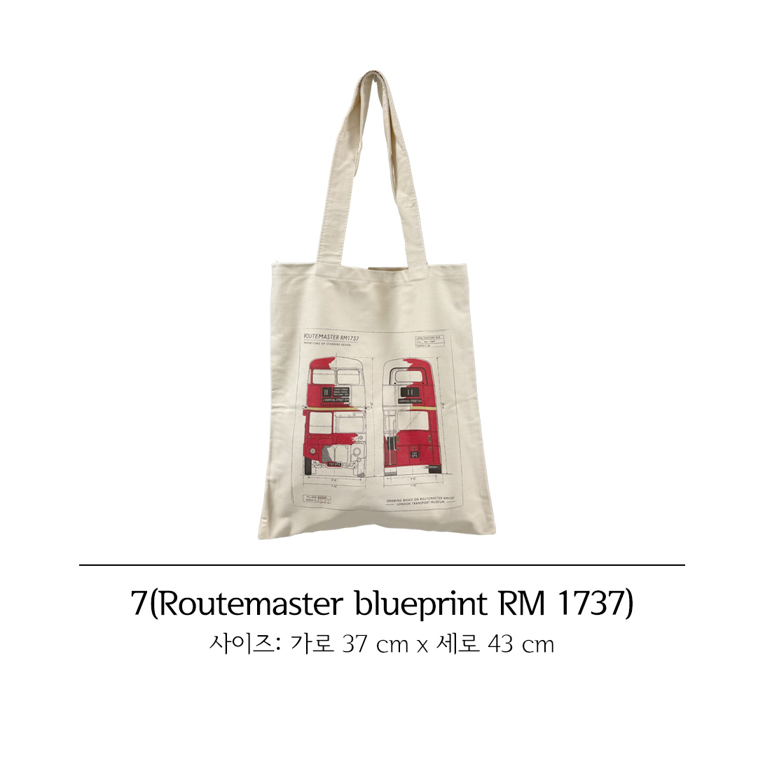 Routemaster blueprint RM 1737 루트마스터는 1954년(AEC)에 의해 1958년부터 생산되어 1968년까지 생산된 2층 버스의 모델입니다. 1956년 런던교통에 의해 소개되었으며 2005년까지 런던에서 지속적으로 서비스를 받았으며 현재 런던 중심부의 한 문화유산으로 남아있는 2층버스의 도면이 프린트 되어있는 가방입니다. 앞뒷면에 동일한 프린트가 되어있고 비침이 없고 두꺼운 가방입니다. (라이센스 계약되어 제작된 제품입니다.)