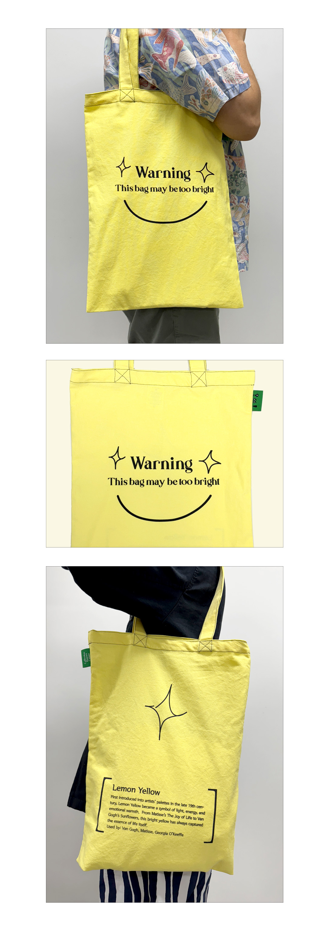 “This bag may be too bright”라는 위트 있는 경고를 더했습니다.