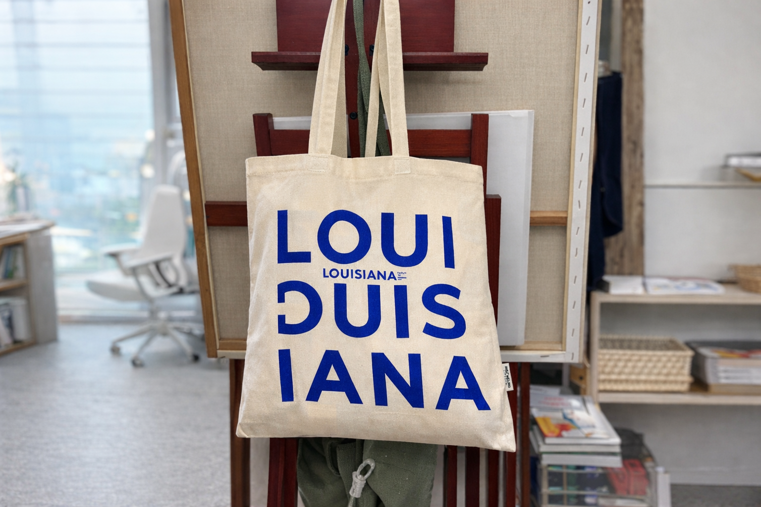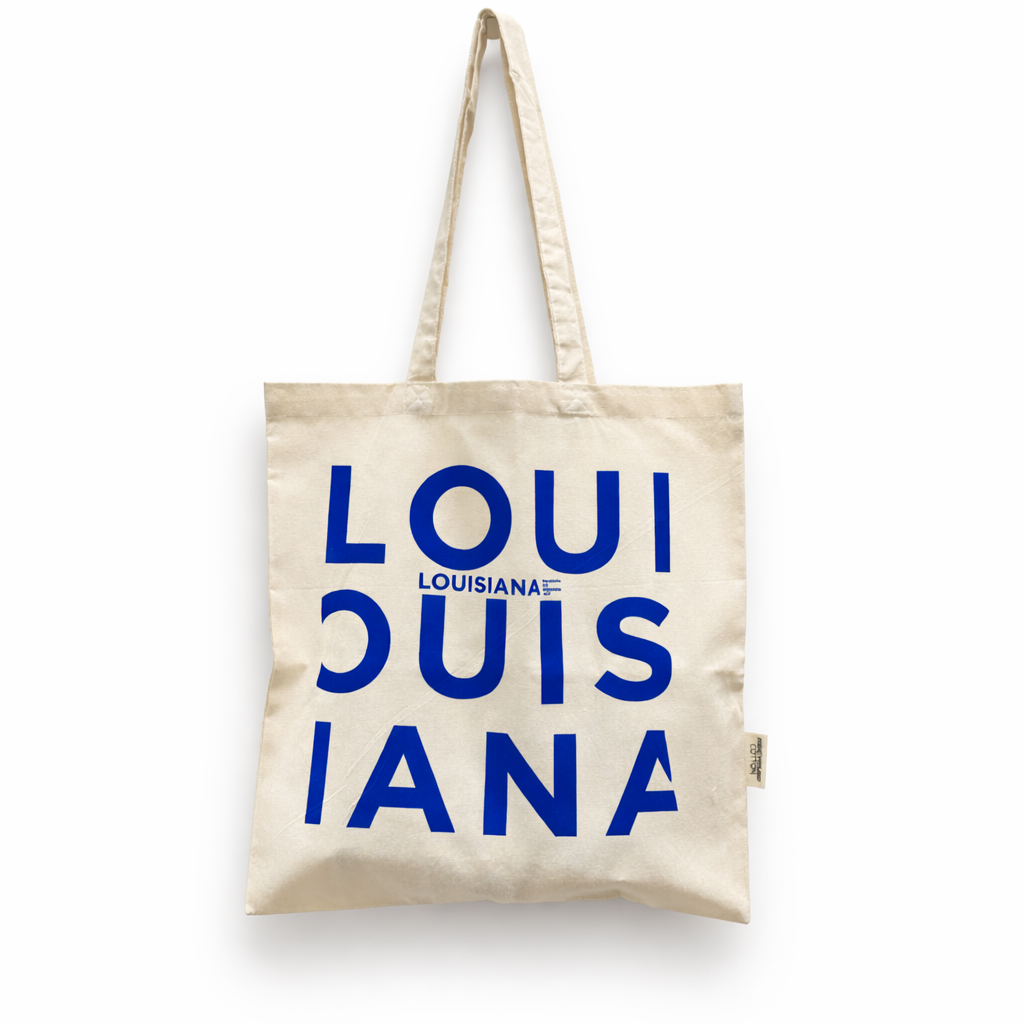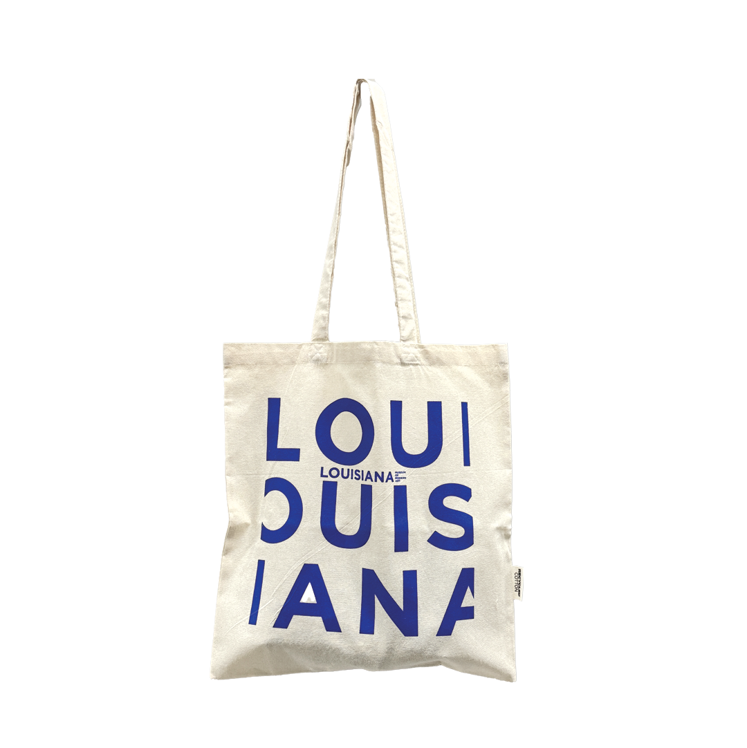 아이보리 캔버스 위에 선명한 블루 로고가 또렷하게 프린트된 루이지애나 미술관 공식 에코백입니다.