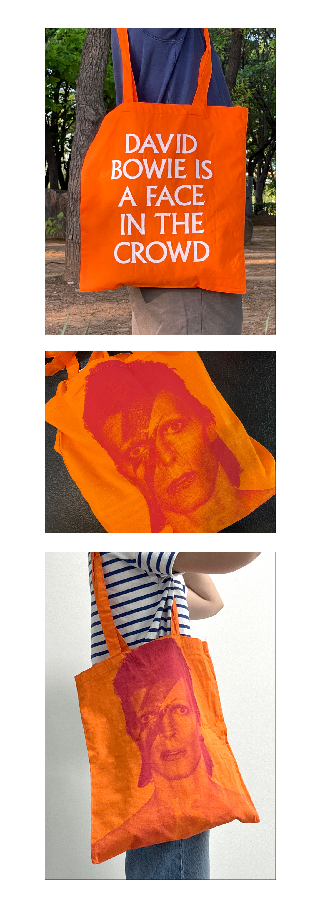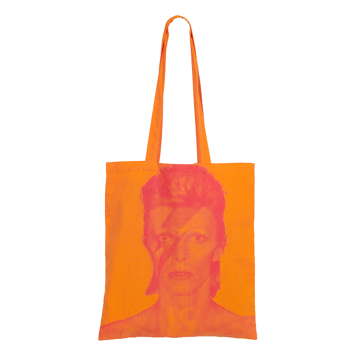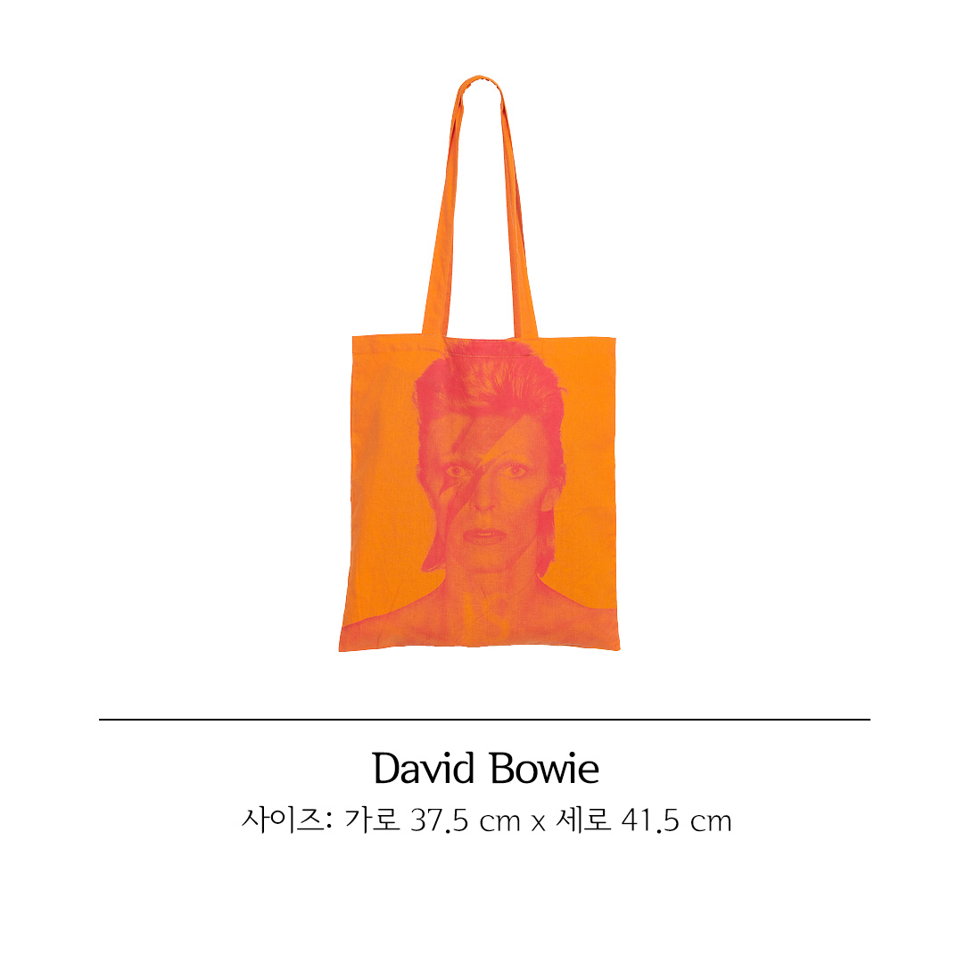 데이비드 보위의 상징적인 이미지가 돋보이는 오렌지 토트백으로, 선명한 컬러와 독창적인 프린트가 개성을 표현해 줍니다. 가볍지만 넉넉한 수납력으로 다양한 소지품을 편리하게 담을 수 있는 실용적인 아이템입니다.